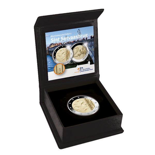 Enige 2 euro met het nieuwe muntmeesterteken in Proof-kwaliteit: de Sint ServaasbrugSlechts 2.000 stuks in omloopVerpakt in een luxe etui met genummerd certificaat van echtheid
