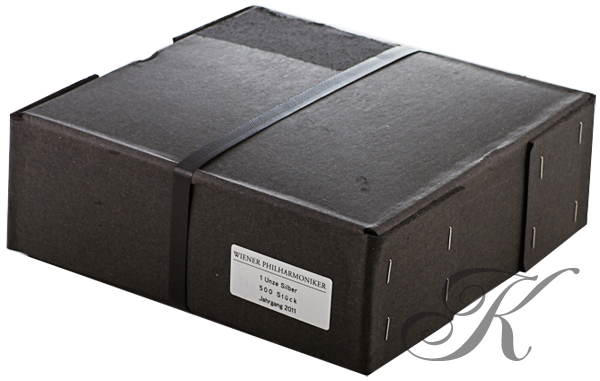 Dit betreft een monsterbox van 500 zilveren Wiener Philharmonikers. De zilveren Wiener Philharmoniker is doorgaans de goedkoopste zilveren beleggingsmunt die een troy ounce zilver (31,1035 gram) bevat. De zuiverheid van deze munt is 99,9%. Deze munten zijn per 20 stuks verpakt in een tube. Een zogenoemde "monsterbox" bevat 25 tubes en omvat dus 500 munten. Normaliter hebben wij een gepast aantal zilveren Wiener Philharmonikers op voorraad, dus geen lange levertijden!